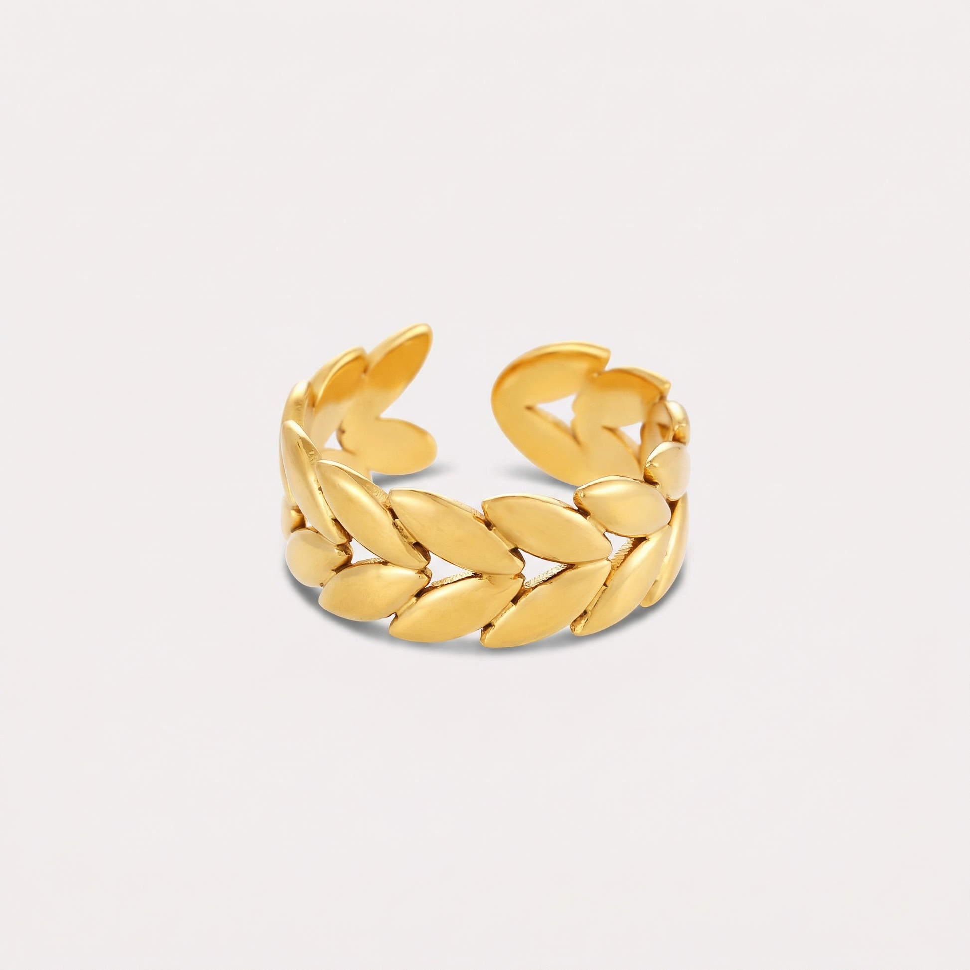 Realizzato in acciaio inossidabile di alta qualità e immerso in oro 18 carati, il design geometrico organico presenta graziosi steli di grano che simboleggiano crescita e abbondanza. L'apertura regolabile garantisce una vestibilità perfetta, rendendo questo gioiello ideale per chi apprezza l'eleganza botanica con un tocco contemporaneo.